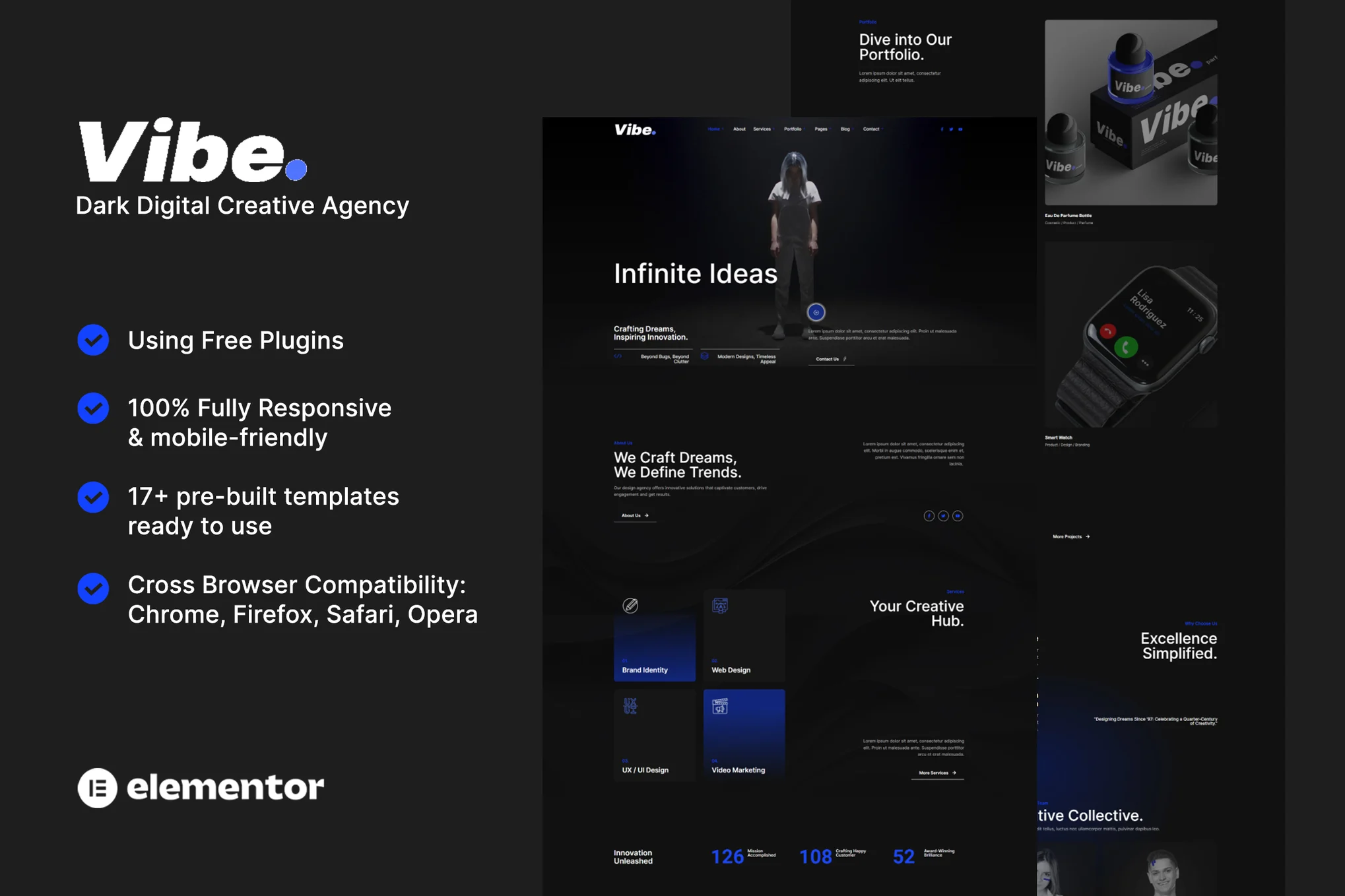 Vibe – Dark style and modern Elementor Template Kit created especially for Digital Agency, Creative Agency, Online Portfolio, Designer and Freelancer website for companies or individuals. Vibe has a beautiful and unique design with a 100% responsive layout, retina-ready, and very easy to customize because using Elementor so you don’t need a single line of coding!